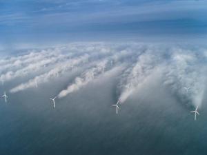 The Horns Rev wake effect, in the North Sea. Picture courtesy renewableenergyworld.com and NOAA.