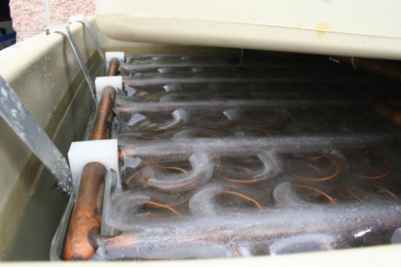 During Ice Charge mode, a self-contained charging system freezes 450 gallons of water in the Ice Bear’s insulated tank by pumping refrigerant through a configuration of copper coils within it. The water that surrounds these coils freezes and turns to ice. The condensing unit then turns off, and the ice is stored until its cooling energy is needed.
