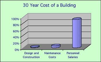 Viewed over a 30 year period, initial building costs account for approximately just 2% of the total, while operations and maintenance costs equal 6%, and personnel costs equal 92%.